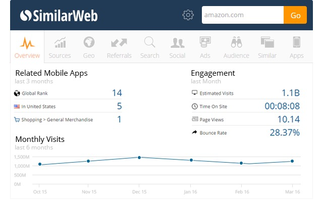 当你打开一个网站,想知道这个网站的流量、来源、排名、竞品等怎么办?那么一定要安装这个插件,Similar Web 可以直接很方便的统统告诉你,使用起来非常直观、方便。