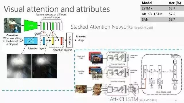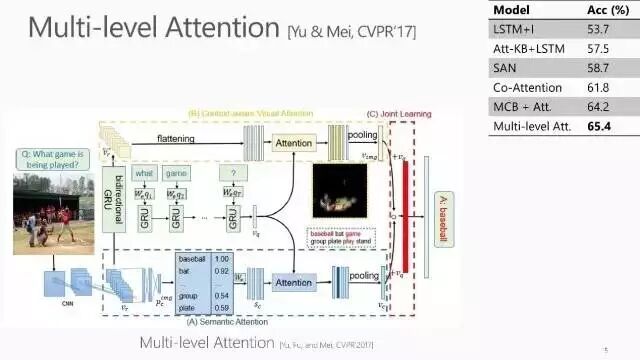 我们今年被CVPR 2017接收的一篇论文中还提出了 multi-level attention:即先学习一个初始的 attention,然后通过image 中不同 region 之间的关系以及问题中不同词素之间的关系来学习 multi-level attention。