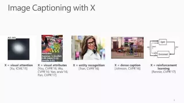 Image Captioning方面的工作可以总结为“Image Captioning with X”,其中的 X 可以是 Visual Attention, Visual Attributes, Entity Recognition, Dense Caption 和 Reinforcement Learning等模块。IBM 最近的一篇 CVPR 2017文章就在 Image Captioning 任务中使用了增强学习,通过在目标函数中加入 reward optimize function 来实现这一功能。