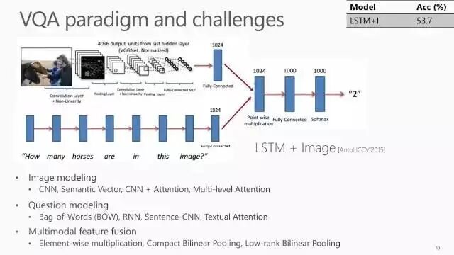 先使用 CNN 学习图片蕴含的特征,同时使用 RNN 学习描述问题的句子中包含的特征,然后将这两个特征进行融合,并对使用 Softmax 等方法对其进行处理来得到最终结果。