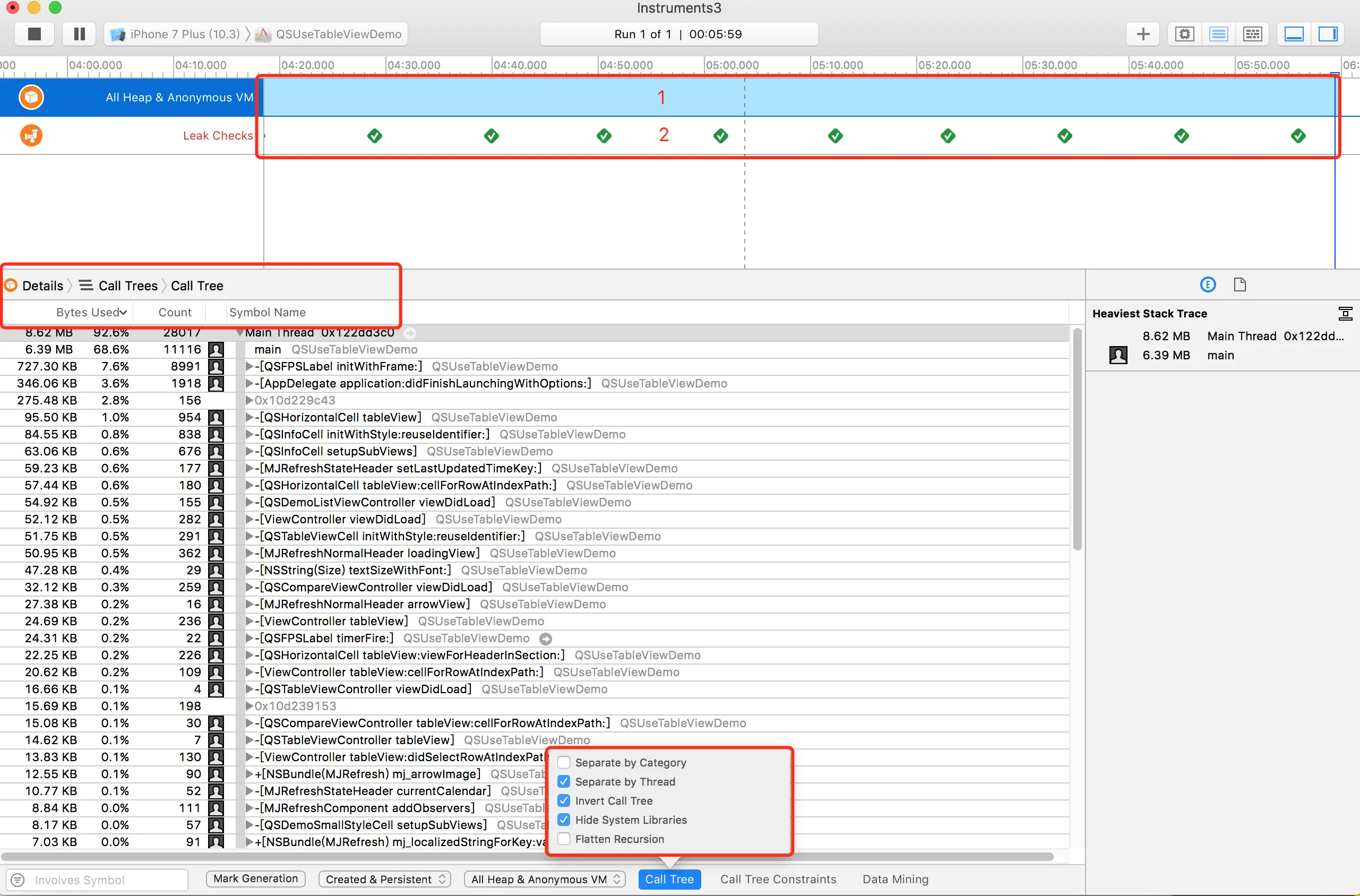 - 在Leaks调试界面上,1是Allocations 模板,显示内存分配情况;2是 Leaks 模板,这里可以查看内存泄露情况。如果红X出现, 表示有内存泄露;主框体区域则会显示泄露的对象。Call Tree选项介绍如下: