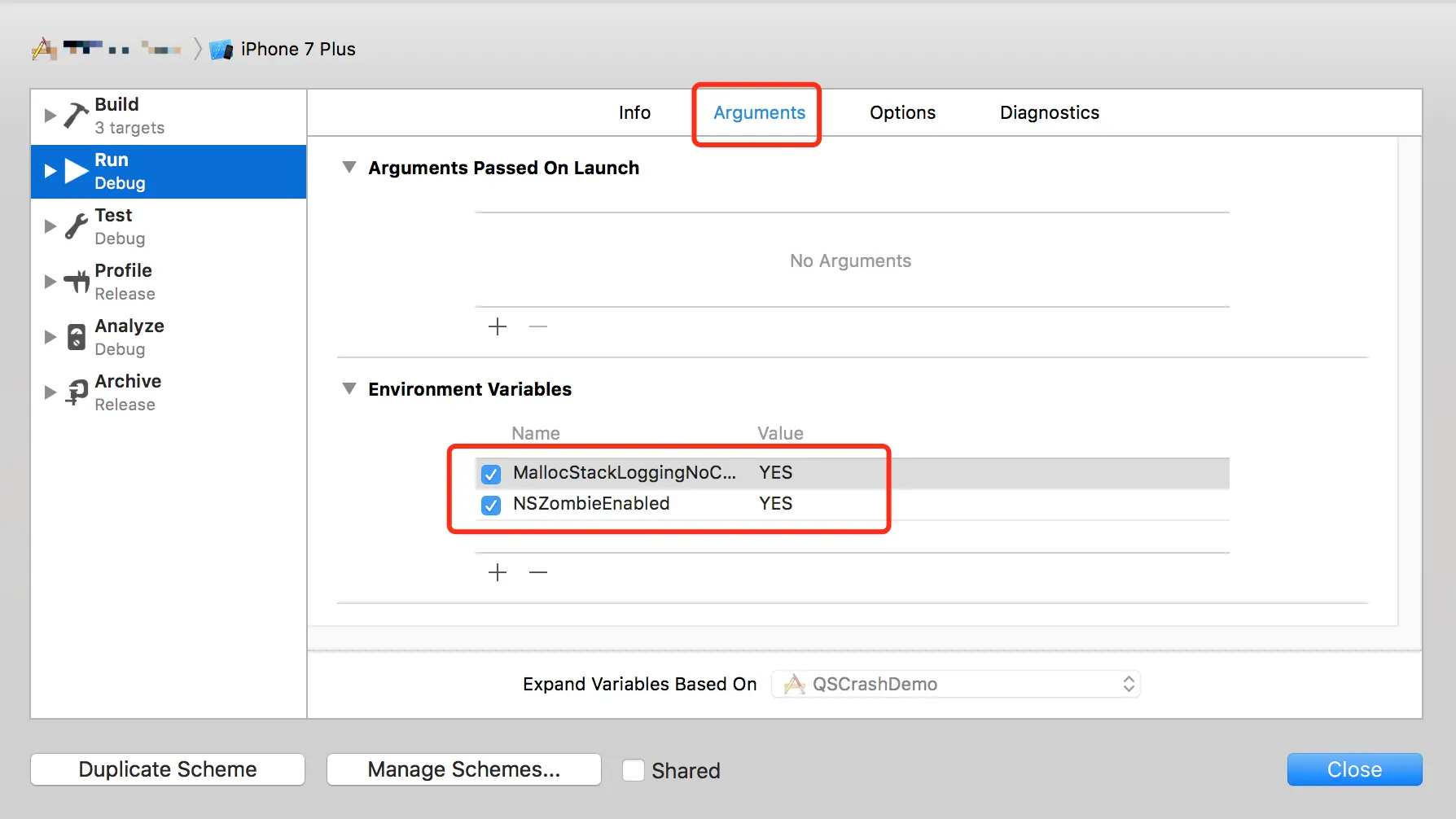 - 然后在Product -> Scheme -> Edit Scheme -> Arguments设置NSZombieEnabled、MallocStackLoggingNoCompact两个变量,且值均为YES。显示如下: