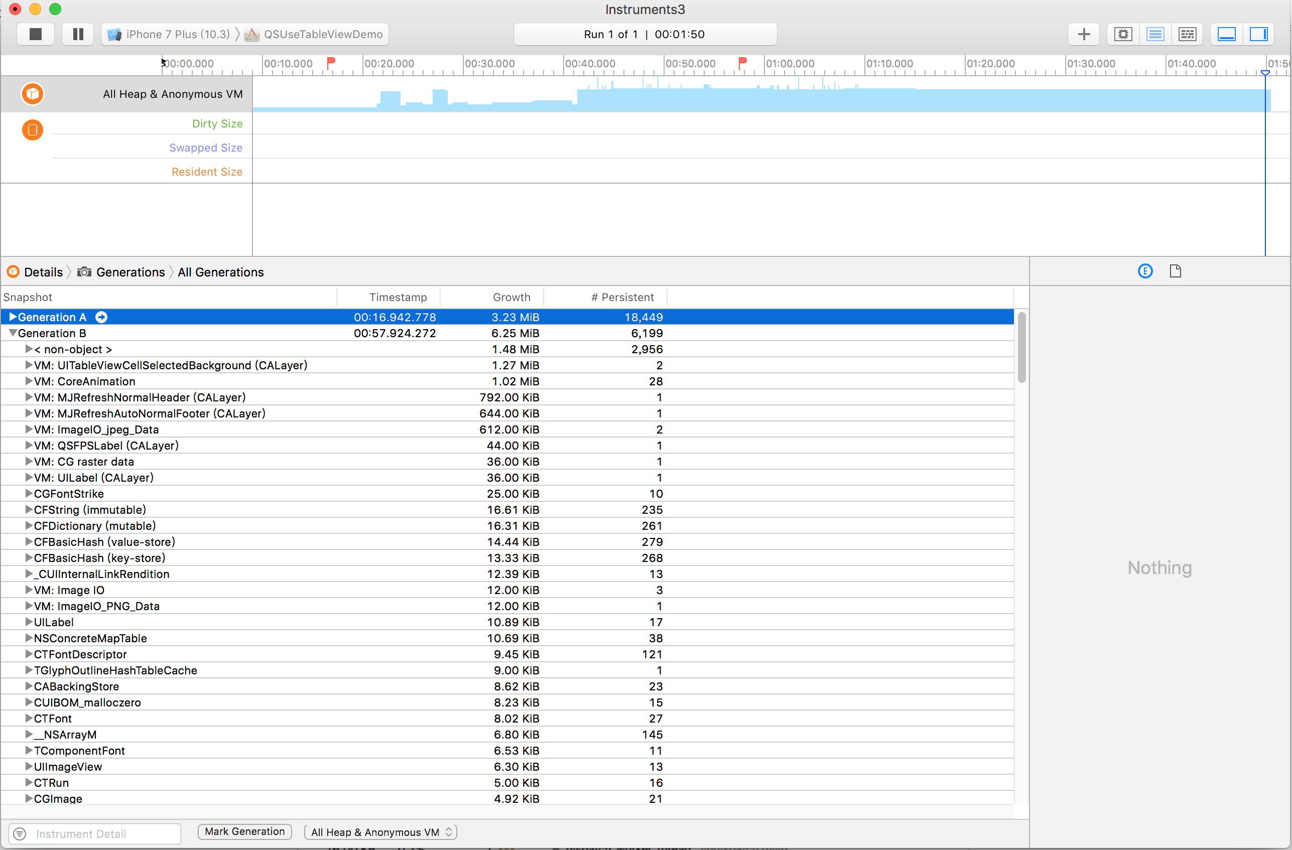 排查该类问题建议使用Xcode提供的Allocation,Allocation可以跟踪应用的内存分配情况。