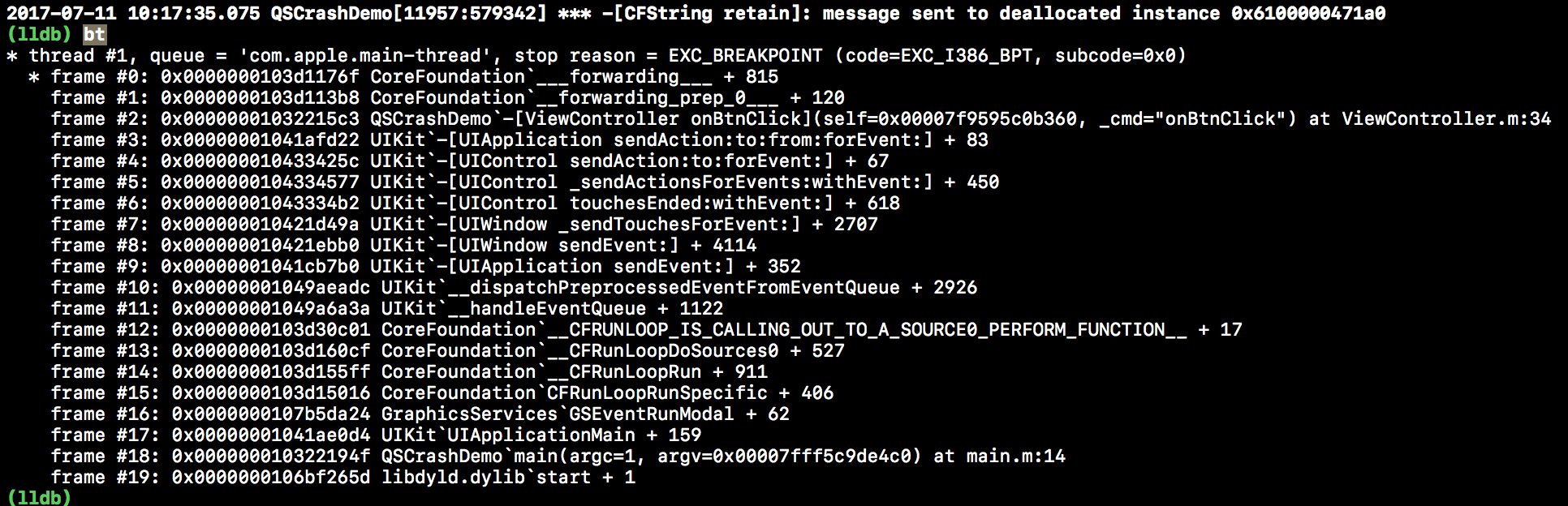 Xcode 6之前还可以使用gdb,可以使用info malloc-history address命令来将发生崩溃的地址还原成具体的代码行,Xcode 7之后只能使用lldb,使用命令bt来打印调用堆栈。下面是某Crash通过僵尸模式调试,使用bt查看的效果。