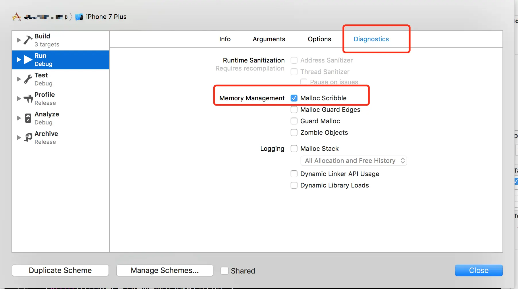 - Xcode提供的Malloc Scribble,可以将对象释放后在内存上填上不可访问的数据,将随机发生变成不随机发生的事情,选中Product->Scheme->Edit Scheme ->Diagnostics - >勾选 Malloc Scribble项,结果如下: