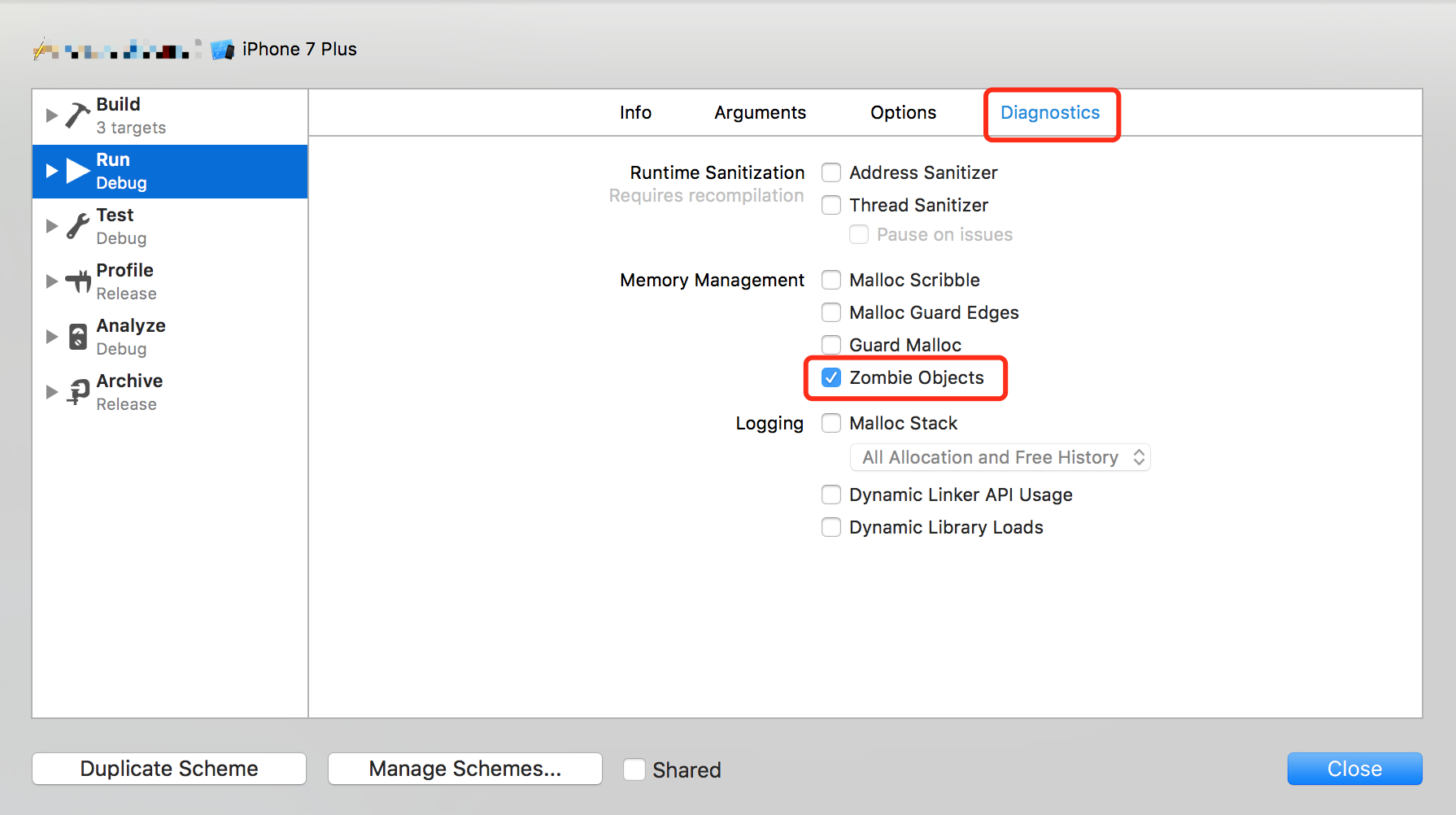 - Xcode提供的NSZombieEnabled,通过生成僵尸对象来替换dealloc的实现,当对象引用计数为0的时候,将需要dealloc的对象转化为僵尸对象。如果之后再给这个僵尸对象发消息,则抛出异常。先选中Product -> Scheme -> Edit Scheme -> Diagnostics -> 勾选Zombie Objects 项,显示如下: