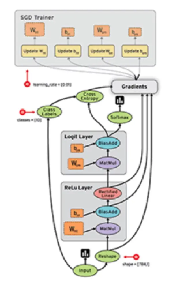 下面这个示例就是一个典型的流程图 (原图来自Google Brain团队的工程师周玥枫在中国举办的2016年谷歌技术大会GDD上的讲课):