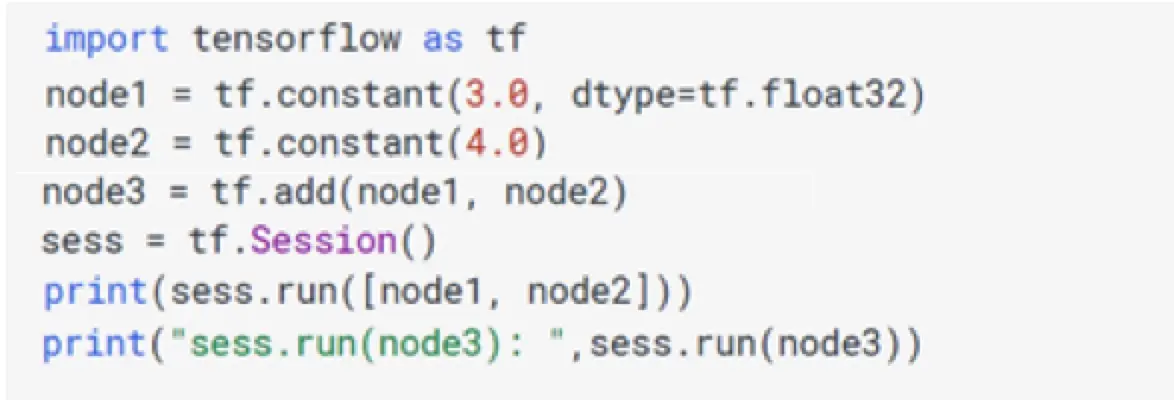 在使用TensorFlow的库类之前,程序必须要先导入TensorFlow的运算功能,所以最前面的代码应该是 import。这样Python的程序才能使用TensorFlow的库类和函数。所以,如果我们的运算程序是要把两个常数加了之后打印出来,那么使用TensorFlow来运行的代码就是如下: