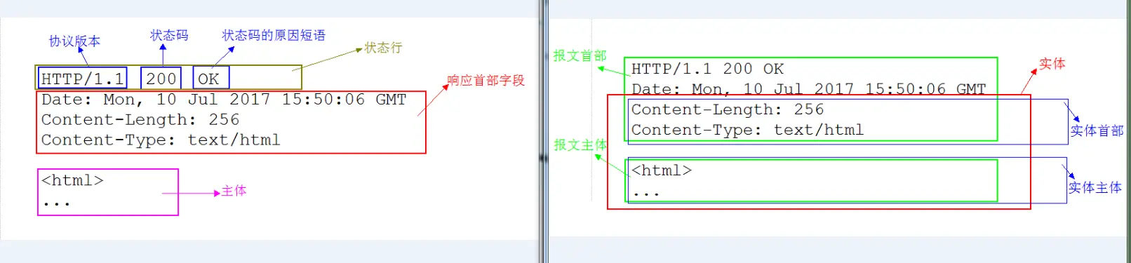我们可以看到,上面示例右图中深红色框的内容就是报文的实体部分,而蓝色框的两部分内容分别就是实体首部和实体主体。而左图中粉红框内容就是报文主体。