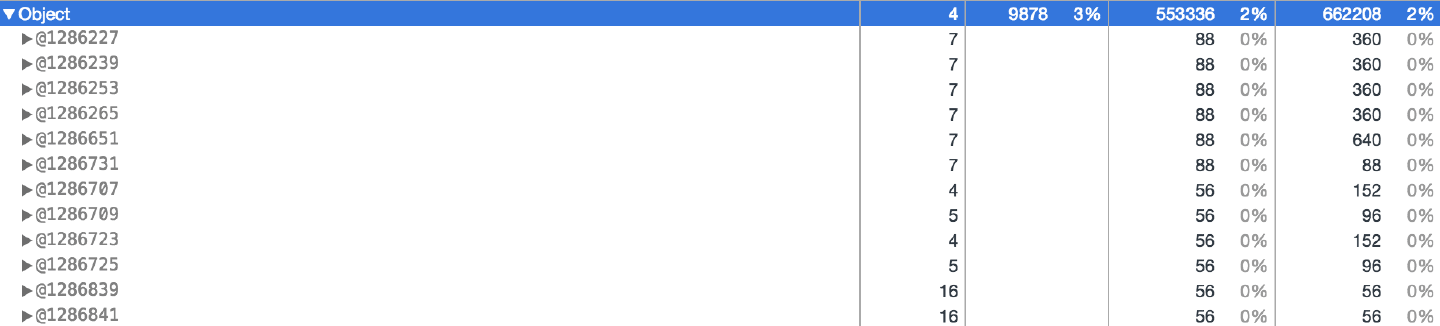 点开最上面的Object,可以看到这个Object数组开销了553K的内存(下图倒数第二列第一行):