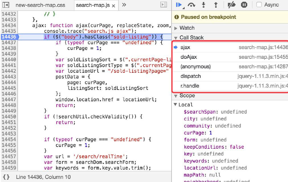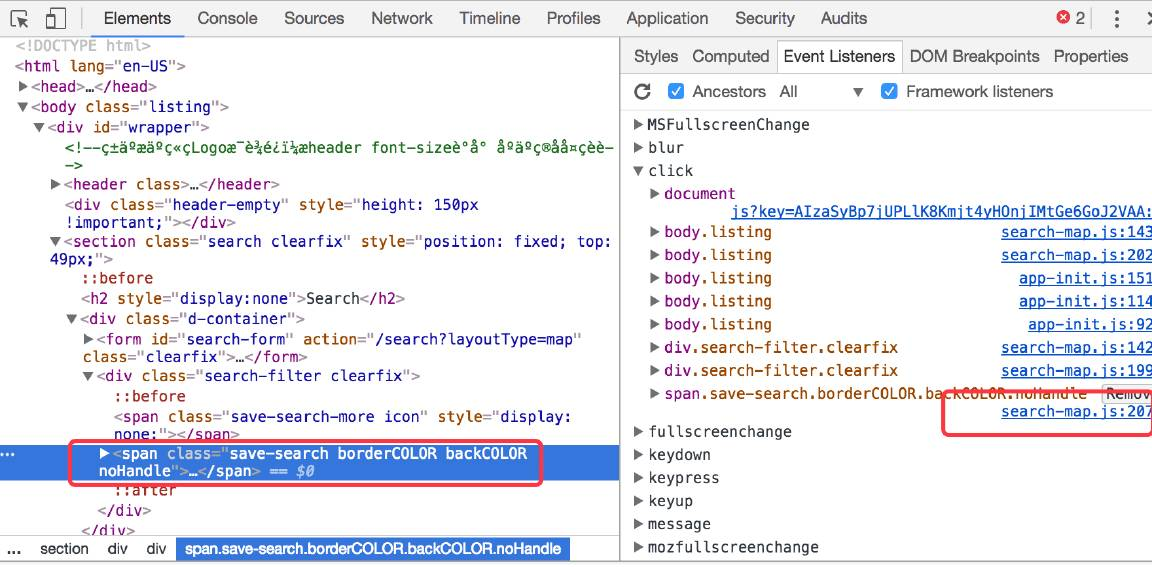 分别点开这两次的代码,就会发现,两次触发分别是:一次是X的click事件调的搜索,另外一次是map的zoom_changed触发的搜索,知道了调用的地方就好办了,就可以做进一步分析,然后去掉其中一个。