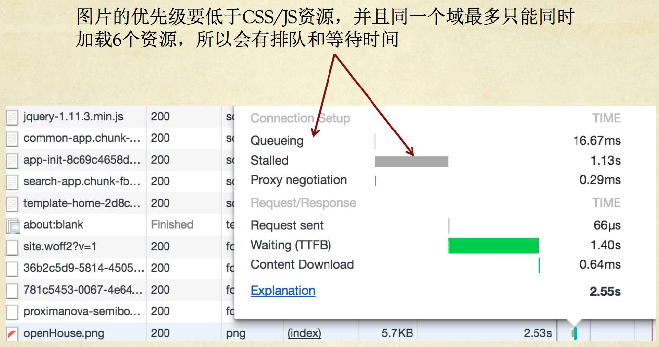 另外图片的优先级会低于CSS/JS资源,并且同一个域最多只能同时加载6个资源,所以会有排队和等待时间,如下图所示: