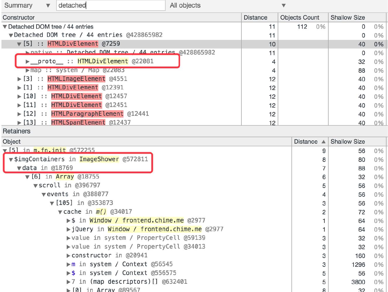 在搜索框里搜一下detached,出来的结果里面红色的表示已经分离且没有引用,而黄色表示已经分离且有引用,所以重点是看这些黄色的。展开其中一个分析一下,可以看到这个HTMLDivElement有一个ImageShower里的$imgContainers指向它,所以导致它的内存空间不能被释放。具体看下代码可以看到这是DOM已经删了,但是图片懒惰加载里面没有清掉引用。所以解决办法是当删掉DOM节点时,把那个ImageShower里面的变量置为null,或者把整个实例对象置为null。