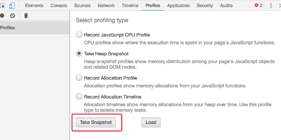 先切到Profile标签,选中Take Heap Snapshot选项,然后点击Take Snapshot按钮: