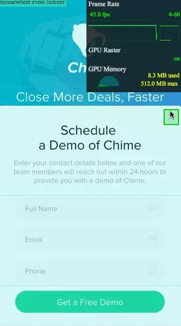 可以看到帧率跌到了45,并且有相当一小段时间帧率是在50以下,所以用postion做的动画流畅度没有transform的好。