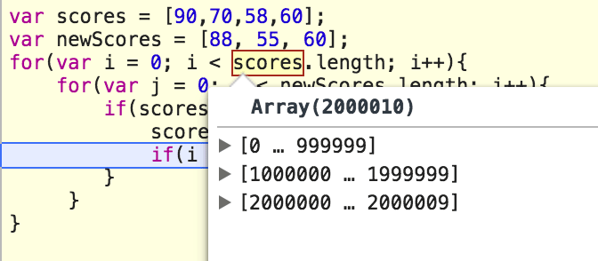 如上面第7行,当i大于1000000时进入断点,这个时候检查一下,发现scores已经变成了一个很大的array了: