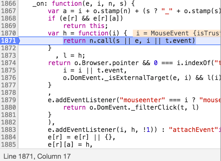 然后再用快捷键一步步的step over/step into,如果你不用快捷键老是一个个去点那个调试的按钮还是挺麻烦的。如果不小心过了,就重新来一遍。最后会找到在这个函数里面画的边界: