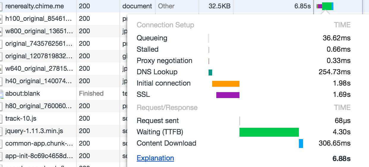 如下图所示:DNS解析花了254ms,建立tcp连接花了1.98s,建立https连接花了1.69s,从建立完连接到接收到第一个字节的数据(TTFB,Time To First Byte)等了4.3s,下载时间花了306ms(基于某次实验)。