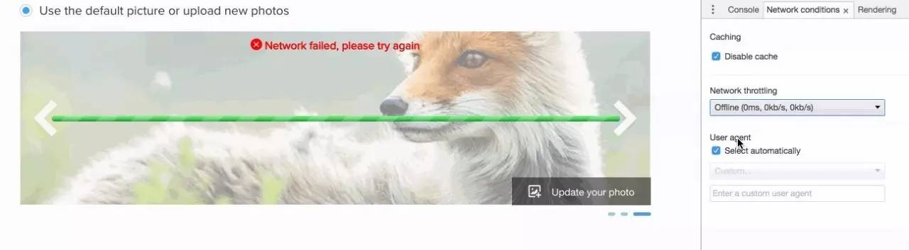 devtools还支持模拟网络情况,例如可以模拟断网的情况,突然挂掉了会怎么样,然后相应的做一些出错处理: