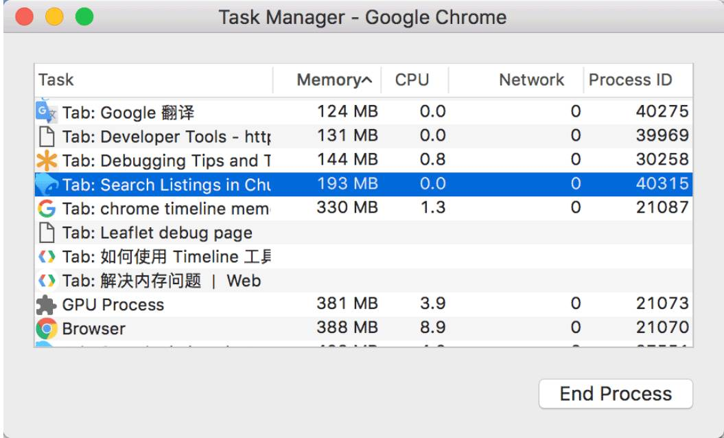 而总的内存可以用Chrome的任务管理器查看:
