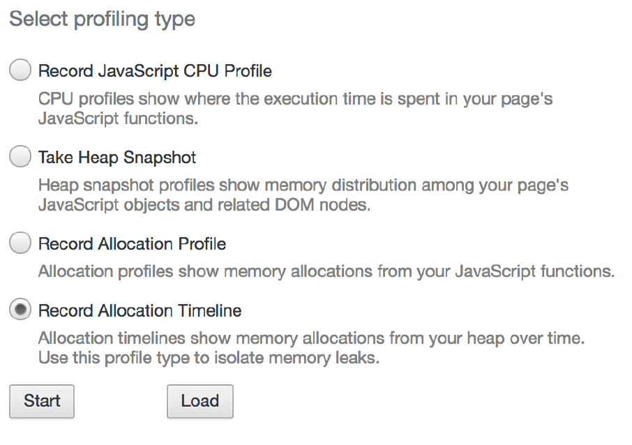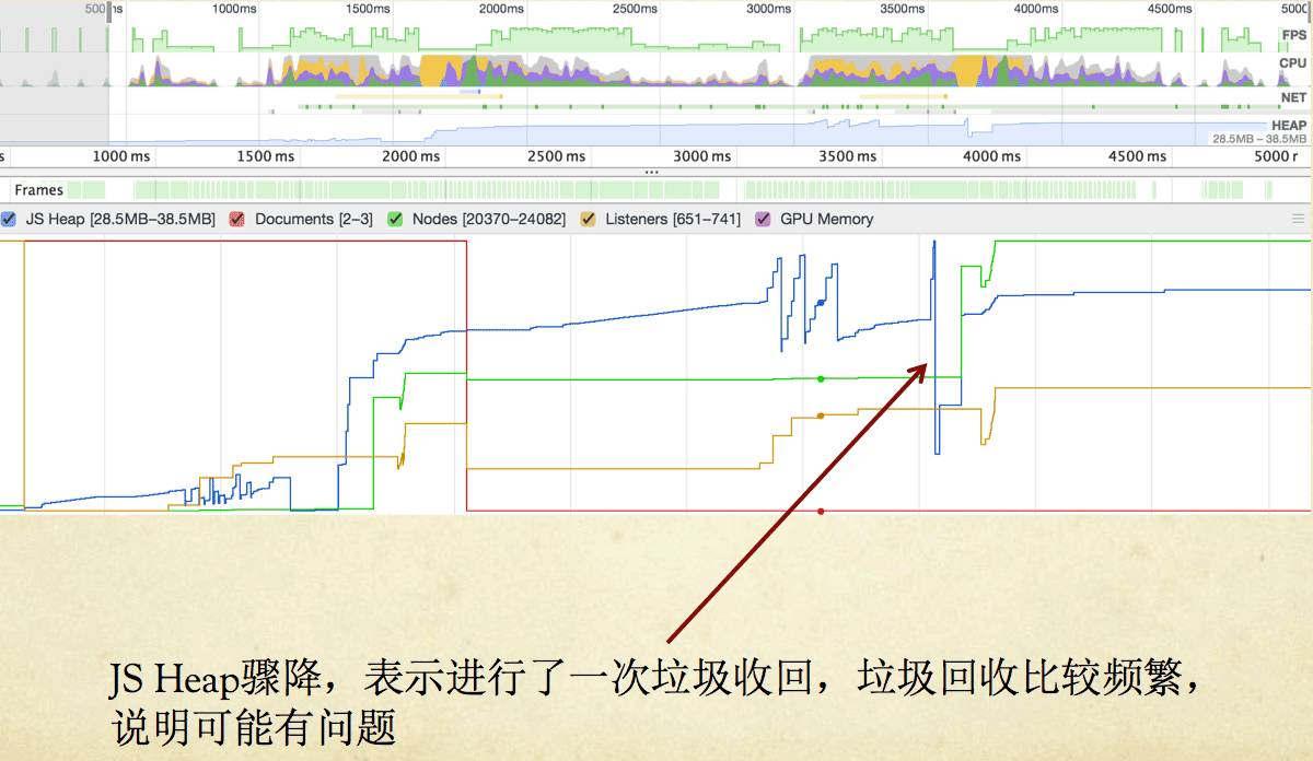 蓝线那里JS Heap骤降,说明进行了一次垃圾回收,如果发生得比较频繁的话,可能会有问题。