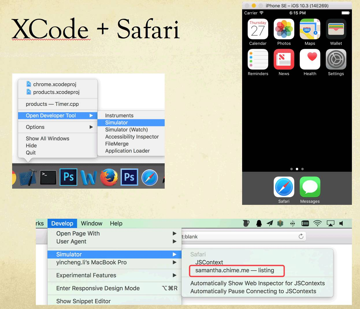 这个虽然和Chrome没关系,但是也可以提一下,Mac的XCode可以开一个ios系统,操作如下图所示,然后可以用Mac的Safari接连这个ios里面的Safari进行检查: