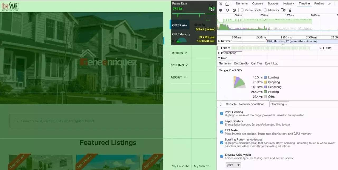 然后点击左边的页面的菜单按钮研究重排的情况。右上角黑色的框会显示当前的帧率。左边变蓝的区域表示需要进行重绘,由于要弹一个蒙层,所以页面可视区域进行重绘了。同时可以看到当前帧率是59,而且整一个过程帧率基本保持在55以上,因为这个是用transform做的动画,所以帧率比较高。再来看一个用postion做的动画: