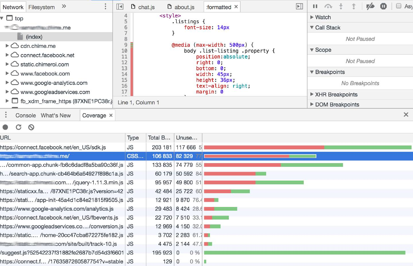 Chrome 49新增了一个功能,能够检查页面上的CSS/JS没有用到的比例,如下打开devtools的Coverage标签栏,然后点记录按钮,刷新页面,页面加载完之后,点击停止。就会显示页面用到和没用的CSS/JS占比。没有用到的用红色表示,用到的用绿色表示: