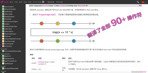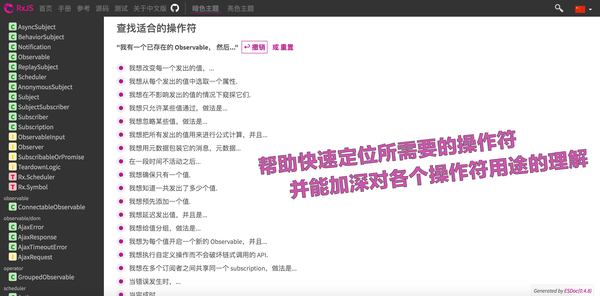 这是 Learn RxJS 的中文版,作者意在通过每个操作符的清晰示例及解释来使读者切入 RxJS 的学习。选择翻译它的初衷就是看重它每个操作符都配有一个或多个示例才阐述这个操作符是如何使用的,单论示例,确实要比官方文档做的好,但语言及原理解释方面不及官方文档,所以我的结论就是配合 官方中文文档操作符篇来学习,效果更佳。