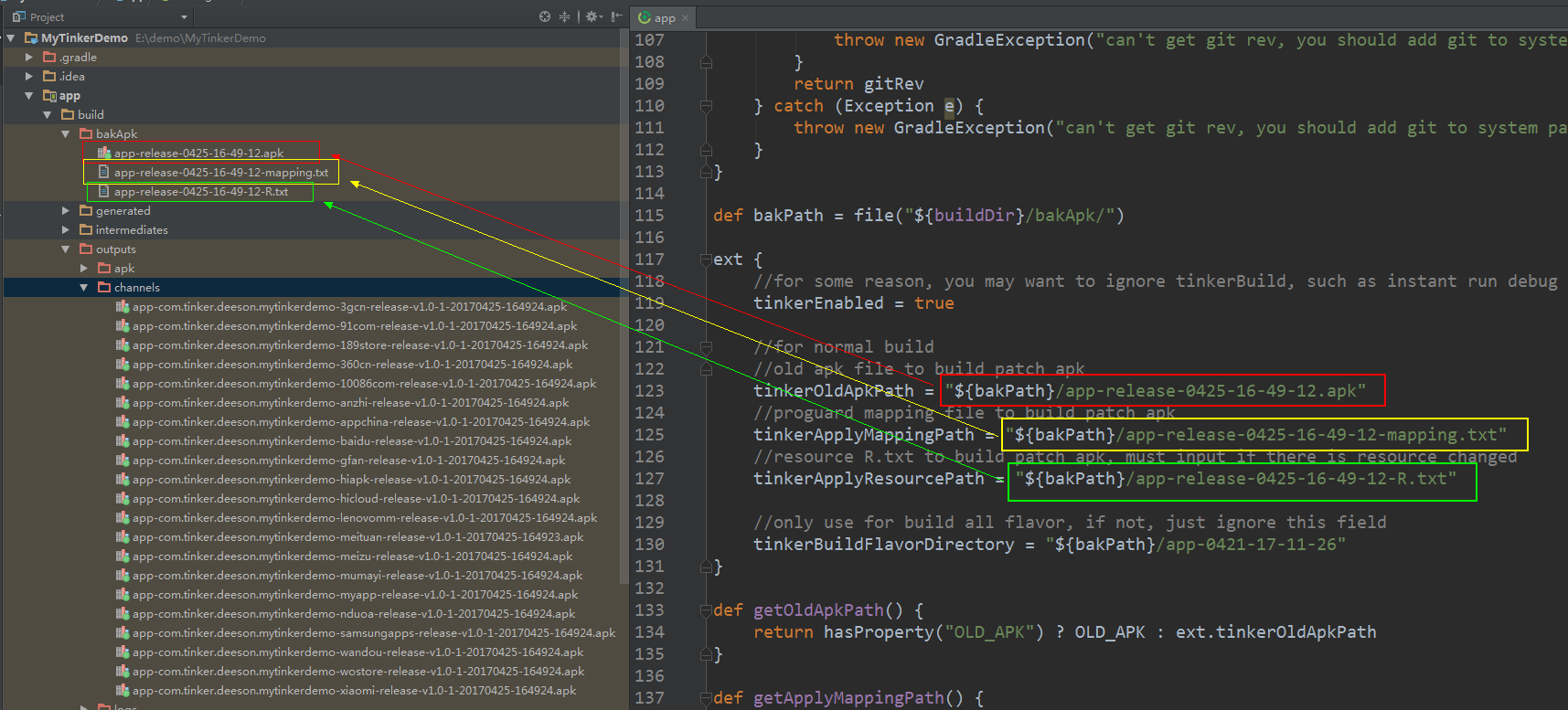 通过上面步骤生成各个渠道包的同时,在build文件夹下,Tinker同样会给我们打出基础包,相信细心的读者在上一张截图里就会发现,bakApk文件夹里即是基础包相关的文件,同样,我们需要将这文件夹里的三个文件的名称填写到 app 的 build.gradle 类的 ext 这里,sync一下,(这里生成的基础安装包和 R文件以及release版本的mapping文件一定要自己保存好,因为每次打补丁包都需要用到这些文件作为基础文件,别弄丢了),如下图:
