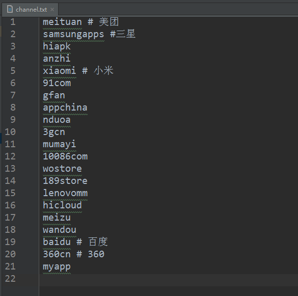 '${appName}-${buildType}-${channel}.apk'可使用以下变量:projectName - 项目名字 appName - App模块名字 packageName - applicationId (App包名packageName) buildType - buildType (release/debug等) channel - channel名称 (对应渠道打包中的渠道名字) versionName - versionName (显示用的版本号) versionCode - versionCode (内部版本号) buildTime - buildTime (编译构建日期时间) fileSHA1 - fileSHA1 (最终APK文件的SHA1哈希值) flavorName - 编译构建 productFlavors 名 - channelFile:包含渠道配置信息的文件路径。 具体内容格式详见下图,支持使用#号添加注释。