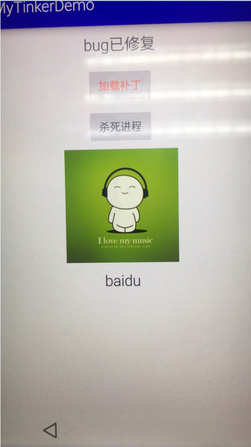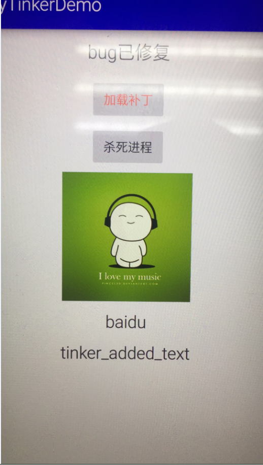 点击加载补丁之后,锁屏或者杀死进程,再次进入demo,补丁已经加载出来,在渠道信息下面增加了一个文本,标识新bug已修复。如下: