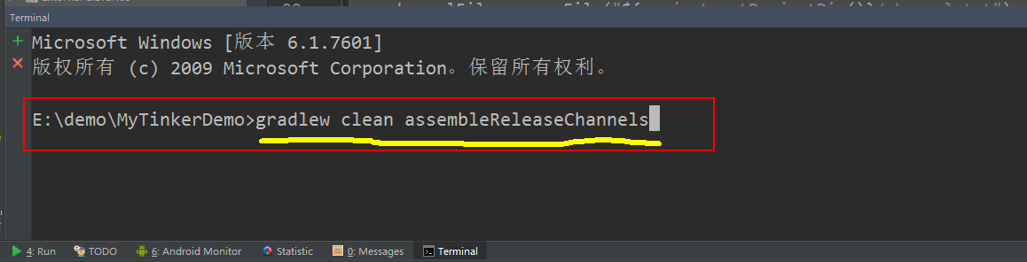 直接在Android Studio 下面的Terminal 窗口敲入如下命令,回车:./gradlew clean assembleReleaseChannels