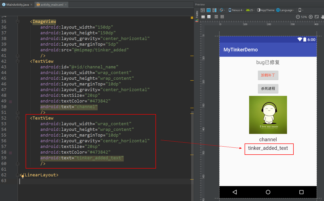 修改项目的bug,demo这里只是增加一个textview控件作为热修复测试,如下图: