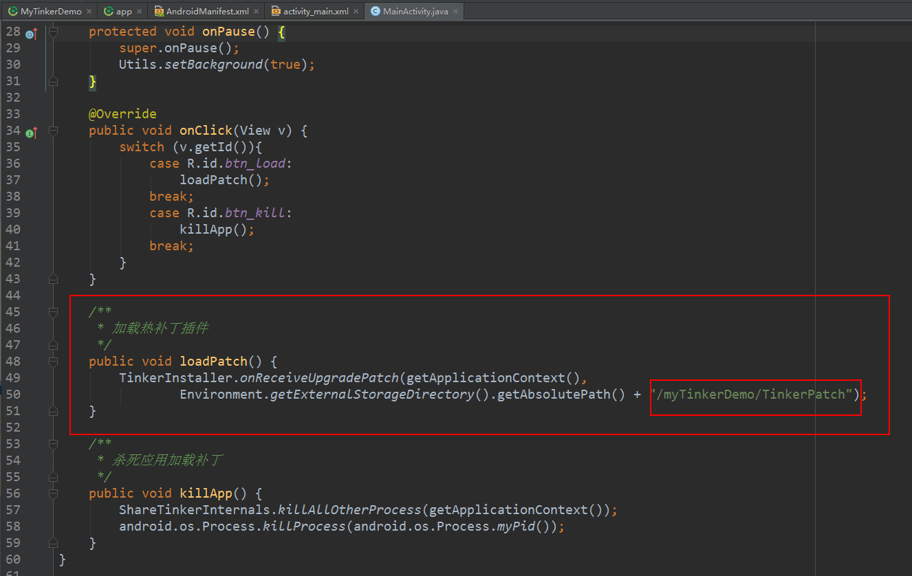将步骤三生成的 tinkerPatch 文件夹下面的 patch_signed_7zip.apk 文件,拷贝出来,改成你的 MainActivity中加载的文件名字,demo这里叫TinkerPatch,将其拷贝到手机的sdcard中的myTinkerDemo 文件夹下,没有这个文件夹你就自己手动新建一个,下图带你回顾一下 MainActivity 的设置: