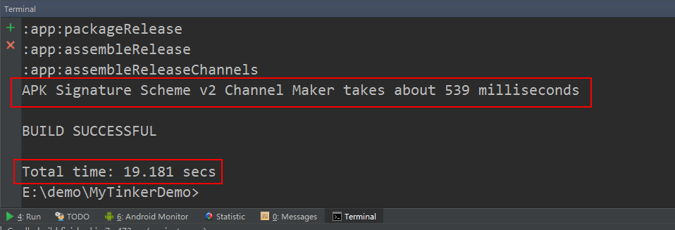 执行成功后,Terminal窗口会显示如下信息,签名耗时539毫秒,下面的19.181秒是包含了编译打包的总时间: