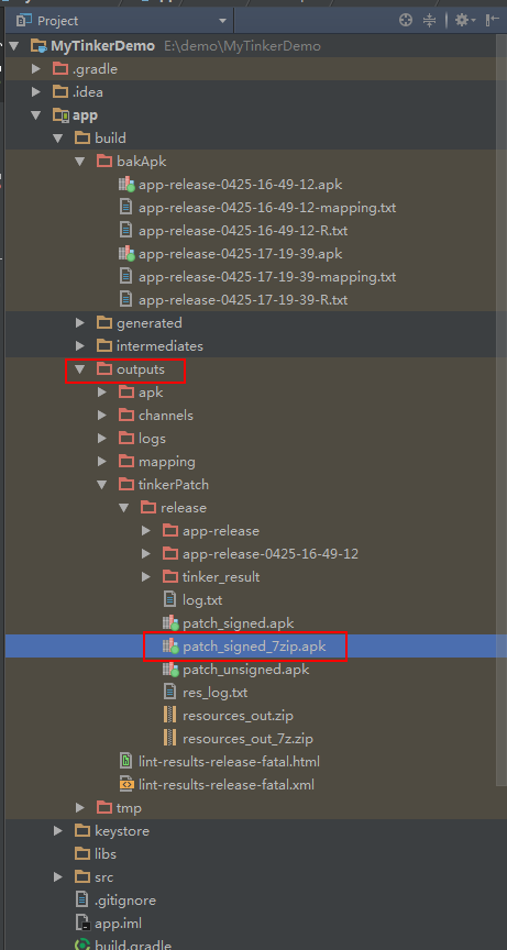 2.紧接着,Tinker 在build 文件夹下的 outputs 文件夹里面会生成我们需要的补丁文件,patch_signed_7zip.apk 就是我们所要的补丁包,如下: