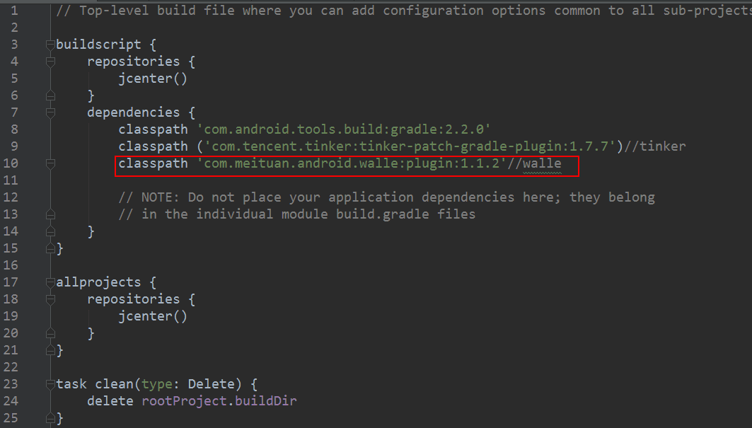 在 build.gradle 文件中添加Walle Gradle插件的依赖,classpath 'com.meituan.android.walle:plugin:1.1.2' 如下图: