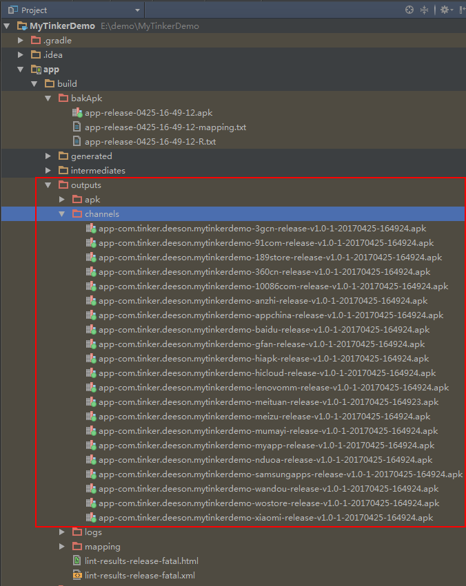 最后我们可以在outputs文件夹里找到我们需要的21个渠道包,这里的渠道包就可以发布到各个应用平台上去,如下所示: