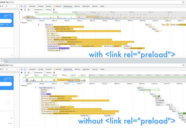 在多页应用中,每一个路由本来就只会请求这个路由所需要的资源,并且通常依赖也都比较扁平。饿了么移动站的大部分脚本依赖都是普通的 <script> 元素,因此他们可以在文档解析早期就被浏览器的 preloader 扫描出来并且开始请求,其效果其实与显式的 <link rel="preload"> 是一致的。