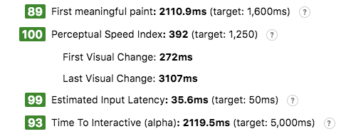 根据 Google 推出的 Web 性能分析工具 Lighthouse(v1.6),在模拟的 3G 网络下,用户的初次访问(无任何缓存)大约在 2 秒左右达到“可交互”,可以说非常不错。而对于再次访问,由于所有资源都直接来自于 Service Worker 缓存,页面可以在 1 秒左右就达到可交互的状态了。