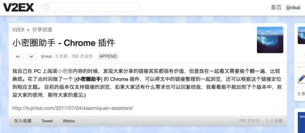 之后,第二天早上我在小密圈t.xiaomiquan.com/3bMbIAY和V2EXwww.v2ex.com/t/373101上介绍了一下我做的插件。选择早上更新的原因是据数据统计,早上8点左右内容的更新点开率会更高。