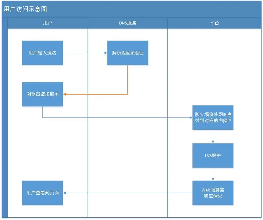 10点,开发和运维反复的检查后,开始怀疑dns解析有问题,但具体是什么问题还不清楚,CTO决定:1、大家都打车往公司走,来公司集体解决 2、在各QQ群、微信群给用户群发解释xxx问题,安抚客户。在车上的时候重新梳理了一下用户的整个访问流程,如下图: