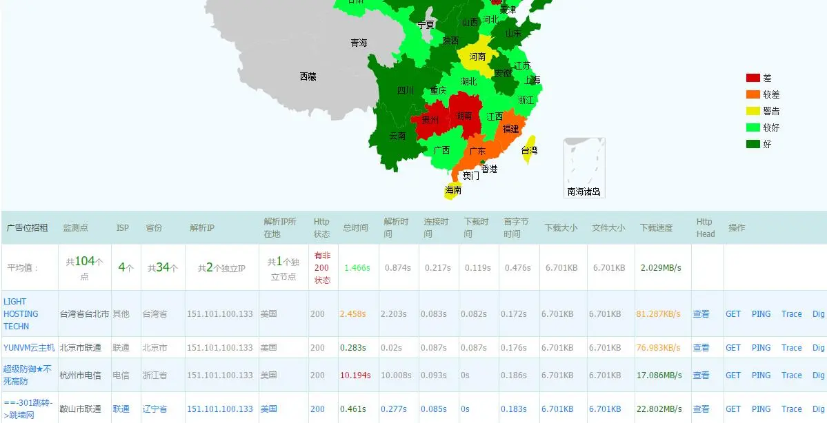 期间领导也开始动用各种关系,联通内部的朋友、网络运维界的大拿帮忙来定位解决,我们也尝试了很多的办法,比如,使用ipconfig/flushdns命令清除本机的DNS缓存、在万网的官网把DNS解析重新更新一边、删除在重新添加等等,也不是完全没有收获。我们一直想找一个可以测试各个地方、运营商网络的办法,终于在各方推荐和搜索的情况下找了17ce 和 360奇云测两个网站,感觉非常实用,在以后的网络定位中,成了我必备使用的工具,可以非常方便的监控各个运营商、各个地区网站的访问是否通不通、访问的速度快不快等问题,截图如下: