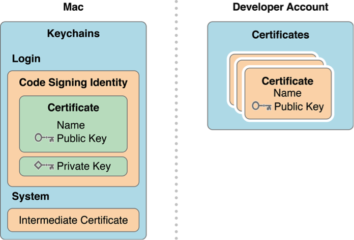 在你Mac的keychain的login中存储着相关的公钥和私钥,而证书中包含了公钥。你只能用私钥来进行签名,所以如果没有了私钥,就意味着你不能进行签名了,所以就无法使用这个证书了,此时你只能revoke之前的证书再申请一个。因此在申请完证书时,最好导出并保存好你的私钥。当你想与其他人或其他设备共享证书时,把私钥传给它就可以了。私钥保存在你的Mac中,而苹果生成的Certificate中包含了公钥。当你用自己的私钥对代码签名后,苹果就可以用证书中的公钥来进行验证,确保是你对代码进行了签名,而不是别人冒充你,同时也确保代码的完整性等。
