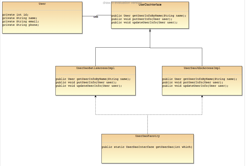 - 具体行为的由其实现类来实现,我们这里举了两个例子:Batis 实现和Jdbc实现(当然也可以缓存实现或file实现等),它实现具体获取或修改数据的行为;UserDaoFactory 生成具体的实现UserDao实现类(请参考下面代码)。