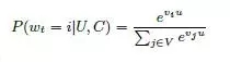 表示在时刻 t,用户U(上下文信息C)在视频库V中精准的预测出视频 i 的类别(每个具体的视频视为一个类别,i 即为一个类别)的概率。上面的公式是一个明显的 softmax 多分类器的形式。其中 u 和 v,分别是用户的 embdded 向量和视频的 embdded 向量,具体怎么来的呢?对于视频向量,文章采用了 word embedding 的方式计算出每个视频的 embedded 向量(原文:Inspired by continuous bag of words language models,we learn high dimensional embeddings for each video in a fixed vocabulary and feed these embeddings into a feedforward neural network),而 u 则是通过输入用户信息和上下文信息给上面模型架构训练得到。