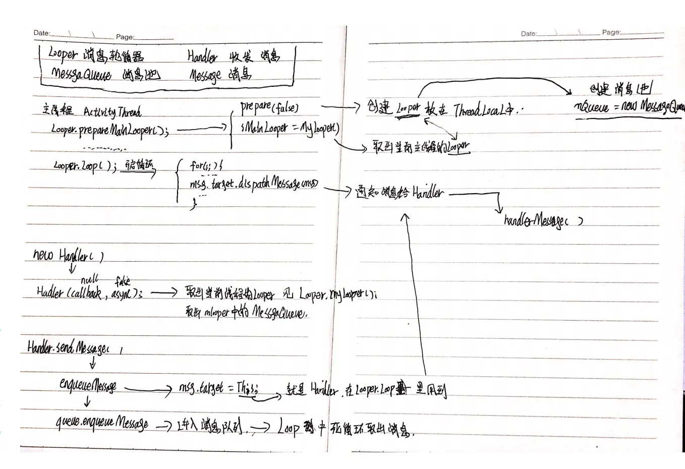最后附一张以前学习Hanlder手写笔记,其实这份笔记光看的话,可能对读者没什么很大做用。但对我的帮助很大。我要表达的是一个学习思路,像类似这种源码分析最好自己拿笔写写画画,映象会深刻很多。知识过久了会忘记,光靠死记若非常人,很难过目不忘。自己写一遍就完全不一样了,就算过了许久已淡忘这些,打开自己的笔记看一眼就会明白。而不用从头来学一遍。