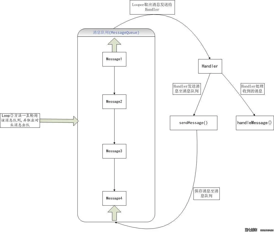 大王,且先随我看小的从网上盗来的一张图。handler发送Message(消息)至MessageQueue(模拟队列),由Looper(循环器)不断循环取出。然后通知Handler处理。这便是整个的消息机制。没有多复杂。
