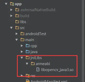 上面的添加依赖库,和自己要编译的so库的写法都是差不多的,就是这些套路。(自古深情留不住,总是套路得人心)同时把sdk中libopencv_java3.so文件拷贝到对应的工程目录下我这里是jniLibs为了方便不然还得配置gradle修改source目录的映射路径: